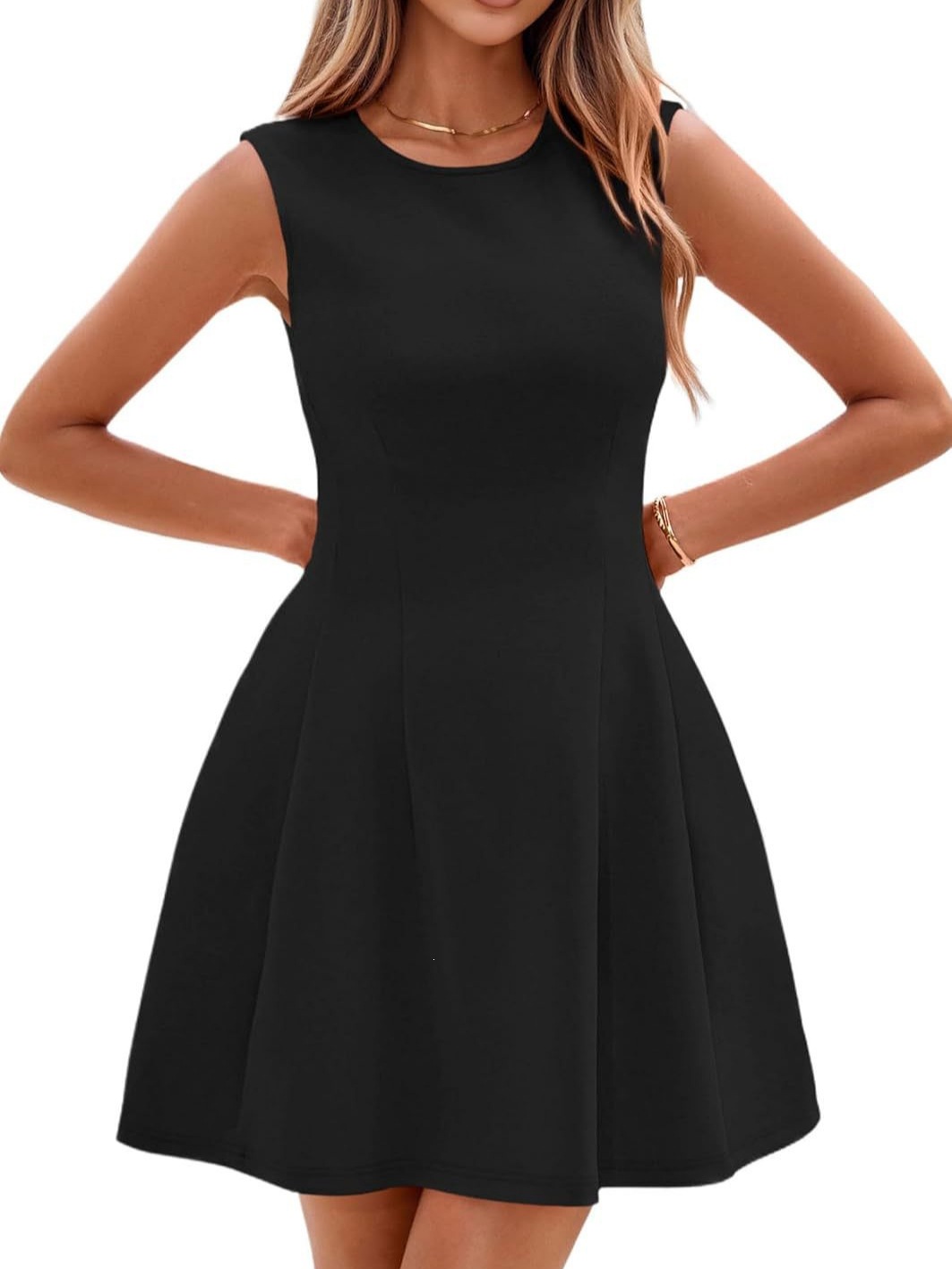Features: Sleeveless design, mid-rise waist with a flared hem, pleated skirt combined with solid color and color-blocking details